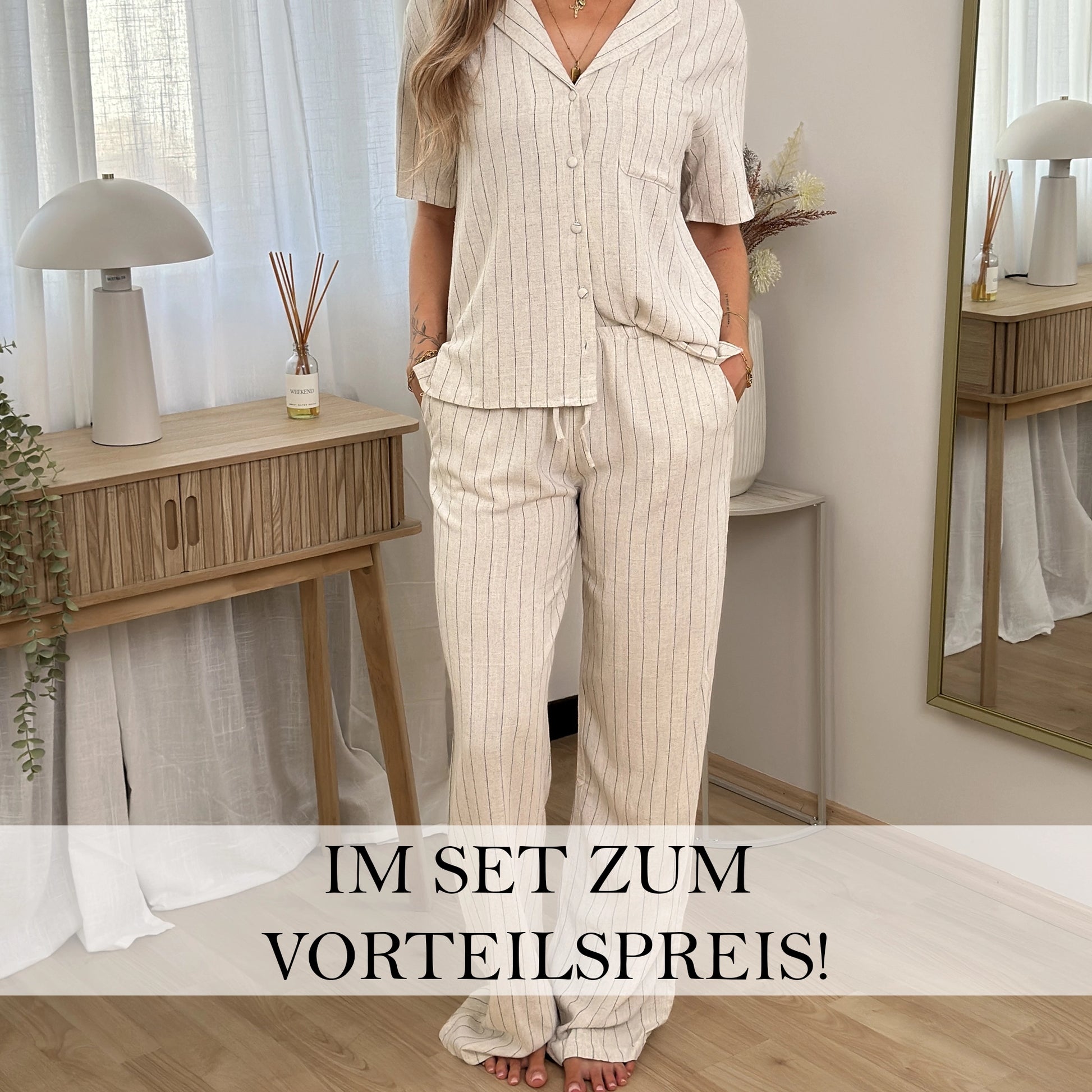 Mit dem AVA-LINÉA Set bekommst du das perfekte Duo für entspannte Stunden – ob zu Hause, unterwegs oder als easy Chic für warme Spätsommertage. Die feinen Streifen, das weiche Material und der lockere Schnitt machen dieses Set zu einem echten Allrounder.