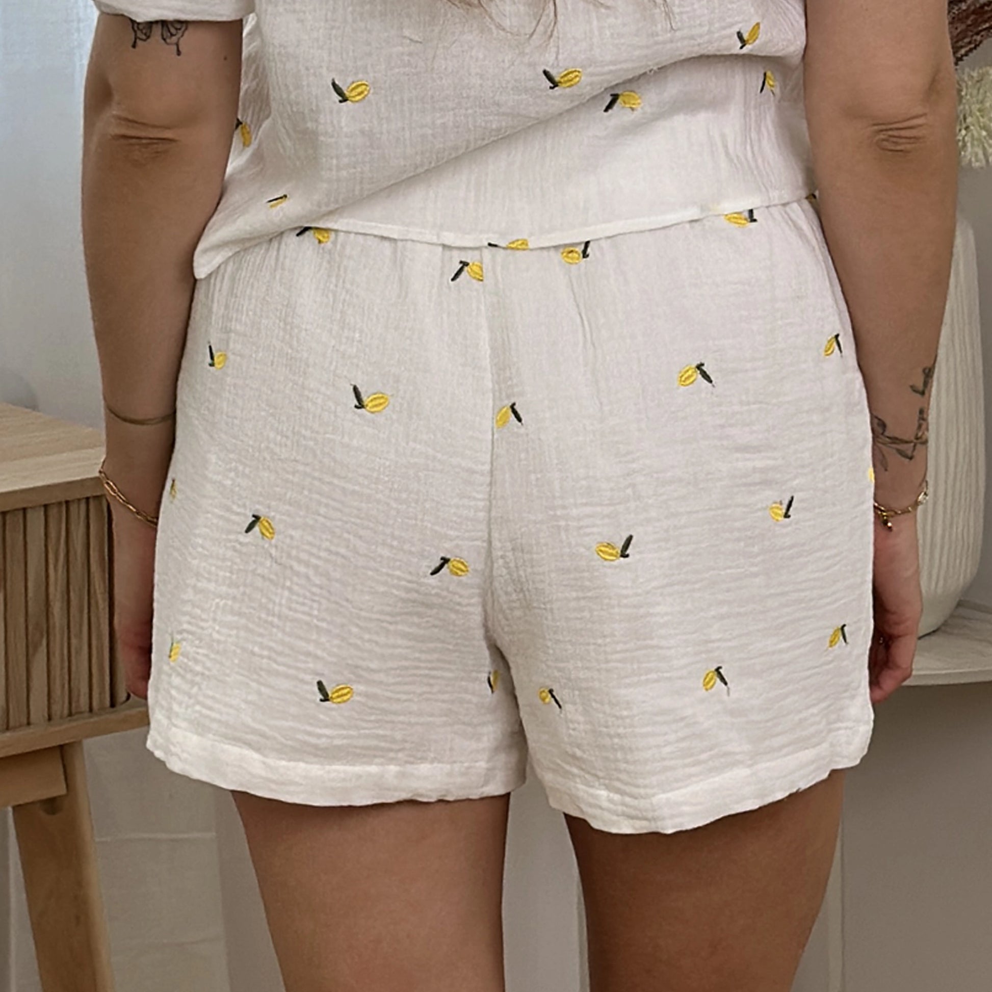 Mit liebevoll gestickten Zitronen auf softem Musselin bringt dieses Set das Gefühl von Urlaub direkt in deinen Alltag. Die verspielten Bindebänder am Top und der elastische Bund an den Shorts machen das Outfit nicht nur zum Hingucker, sondern auch zum Komfort-Favoriten.